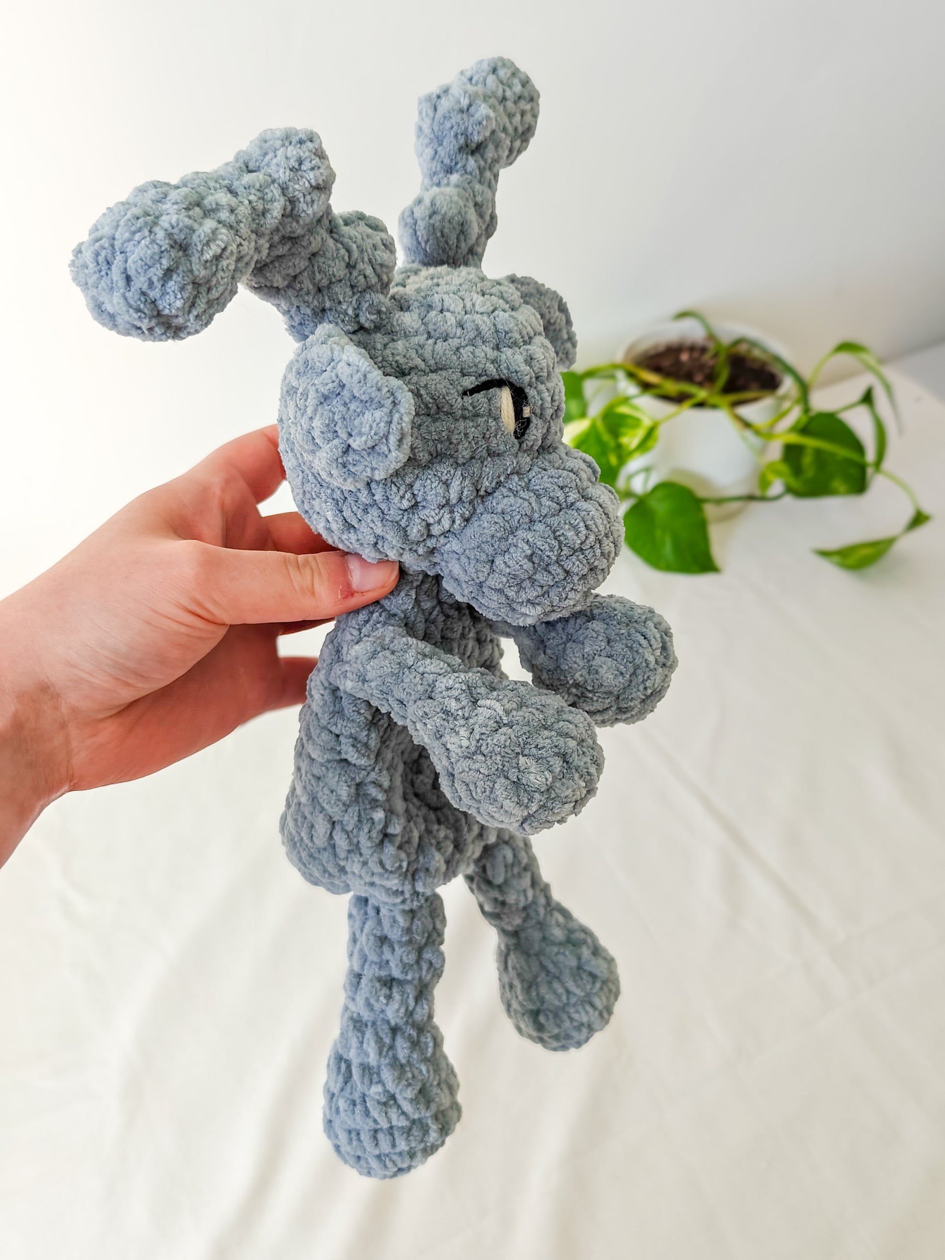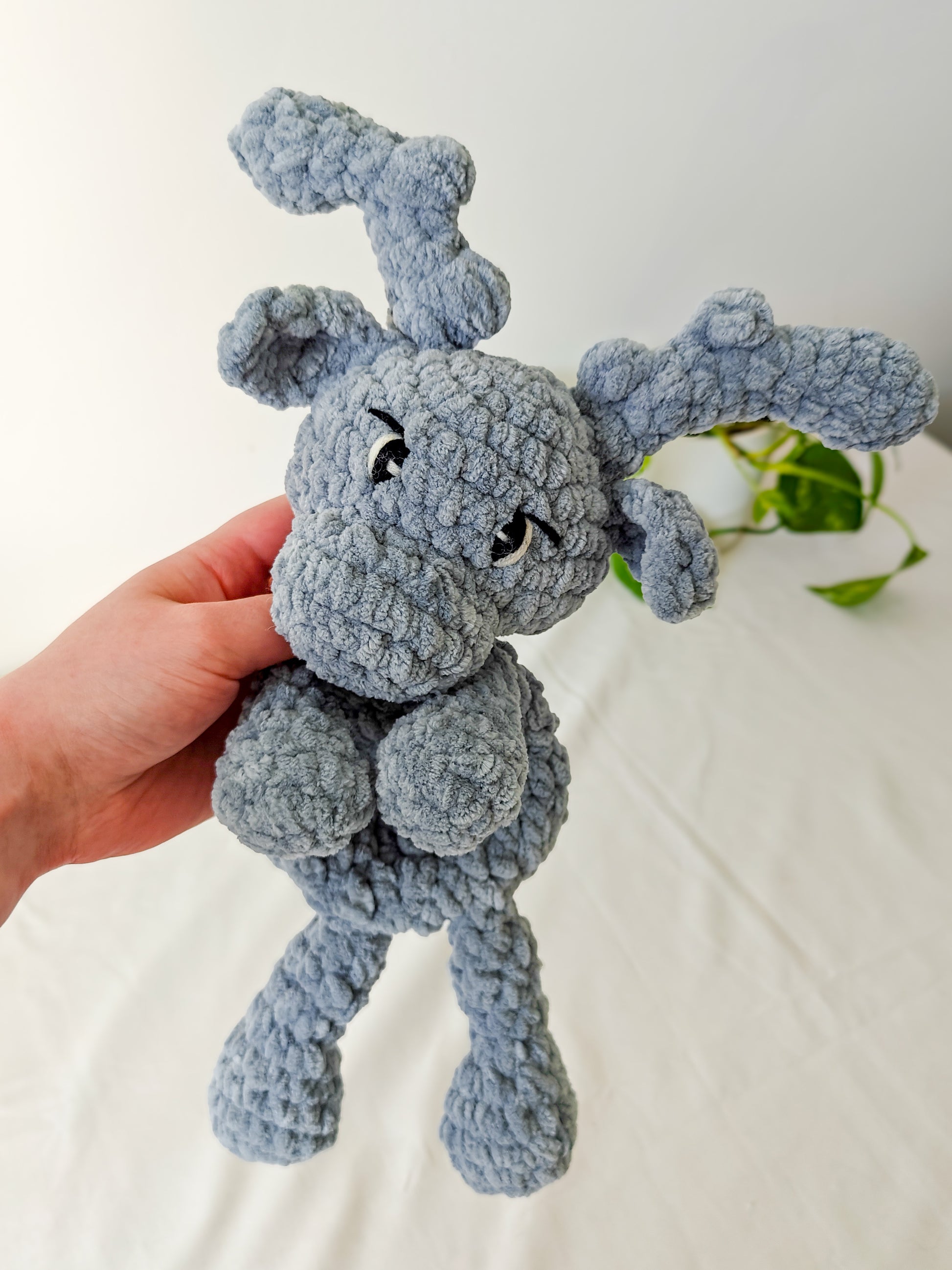 Käsintehty söpö ja pehmeä harmaa poro sinisillä silmillä. Valmistettu ihanan pehmeästä ja pörröisestä langasta. 100% polyesteri.