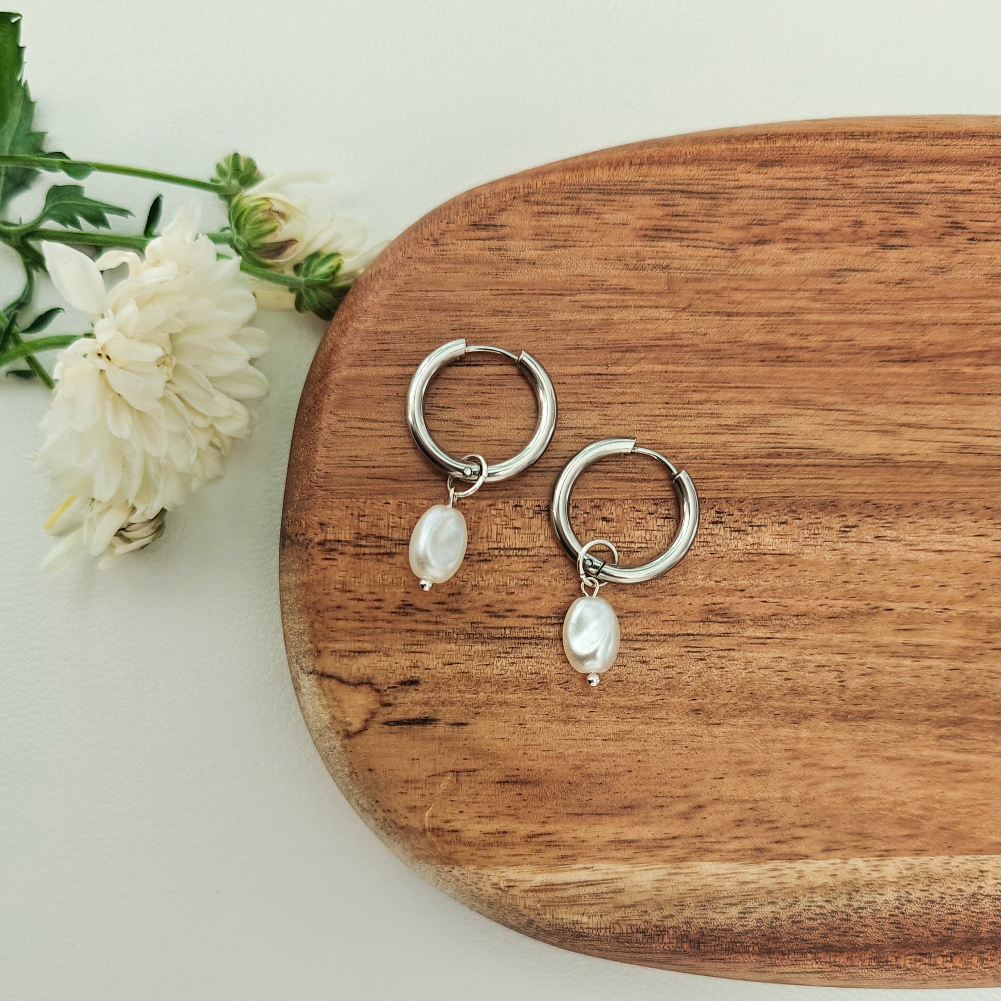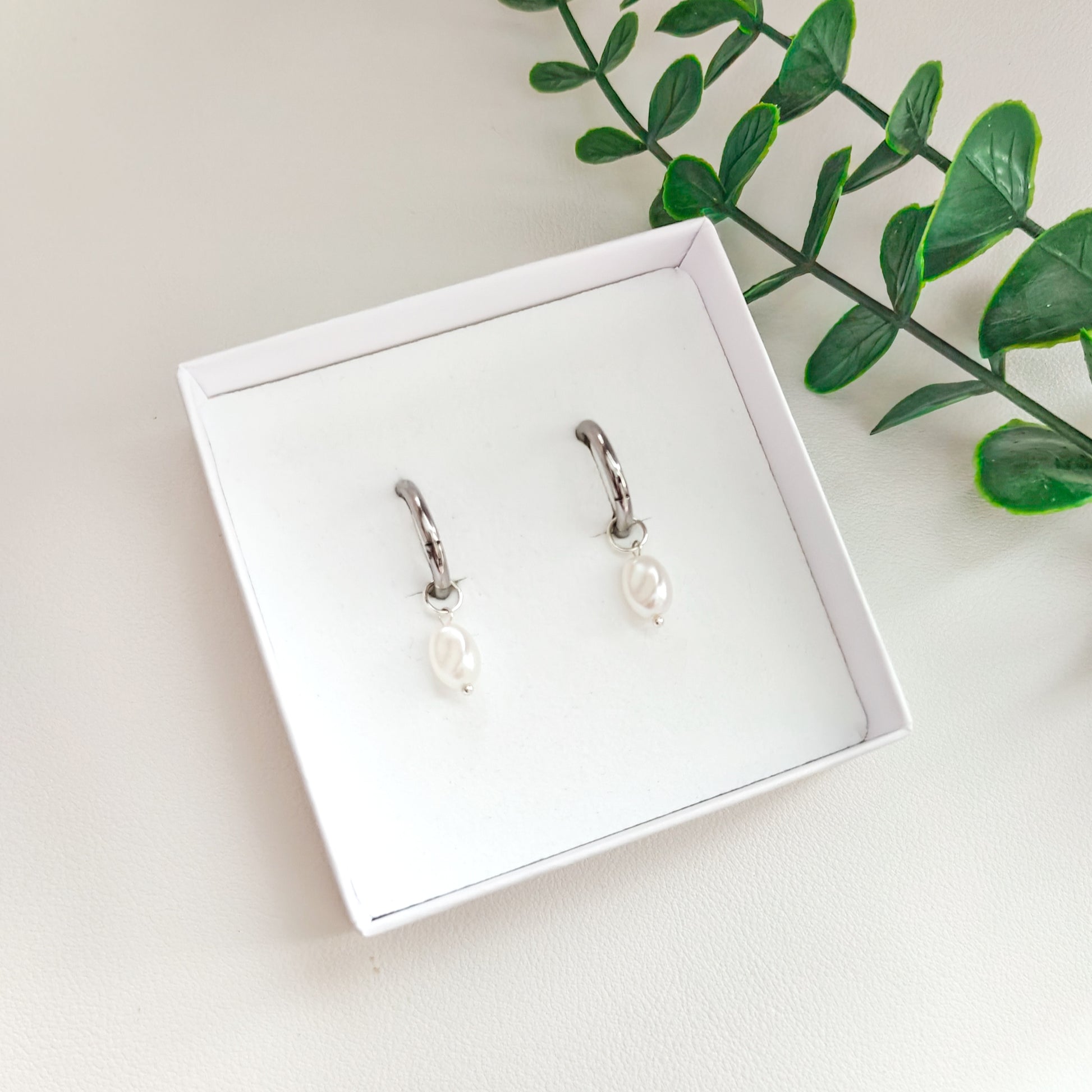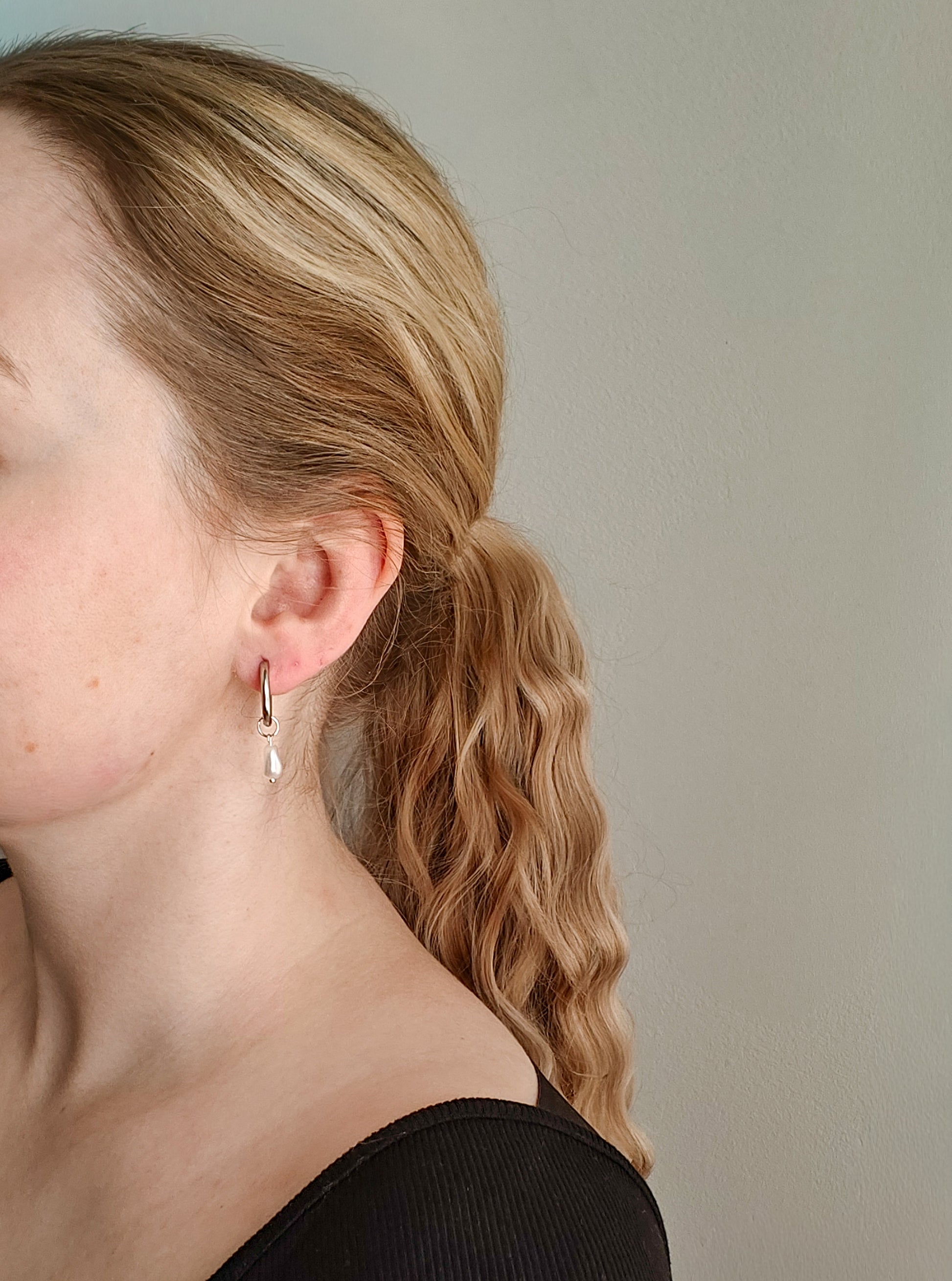 Hopea rengas yhdistettynä helmeen on klassinen yhdistelmä, joka sopii hyvin joka tilanteeseen. Näitä on kevyt käyttää korvissa pidemmänkin päivän ajan. Helmi on akryylia ja rengas on ruostumatonta terästä.