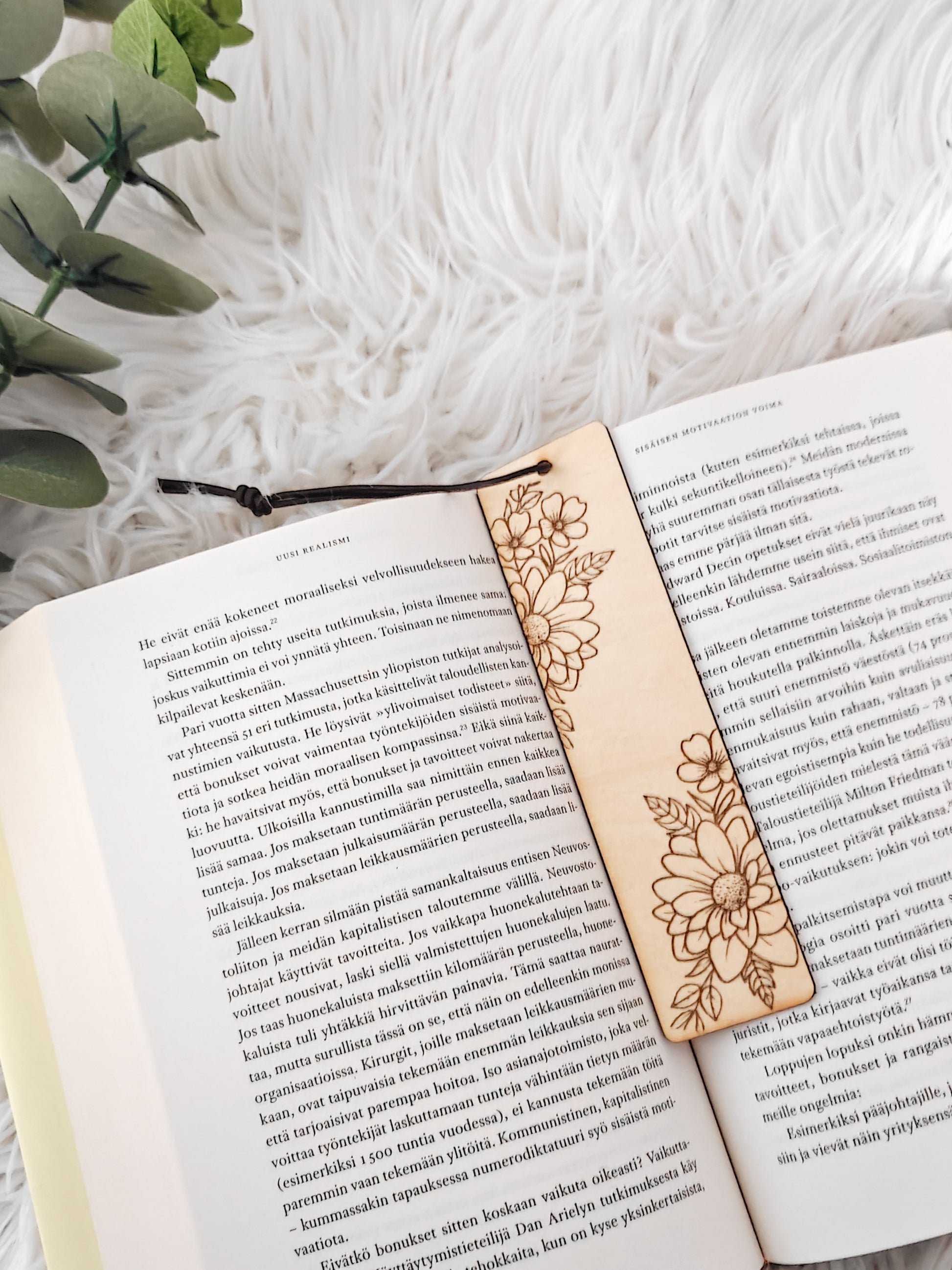 Käsityönä puusta valmistettu kirjanmerkki. Jokainen kirjanmerkki on uniikki - pieni taideteos, jossa yhdisty luonnonmateriaalien aitous ja tarkka käsityö.