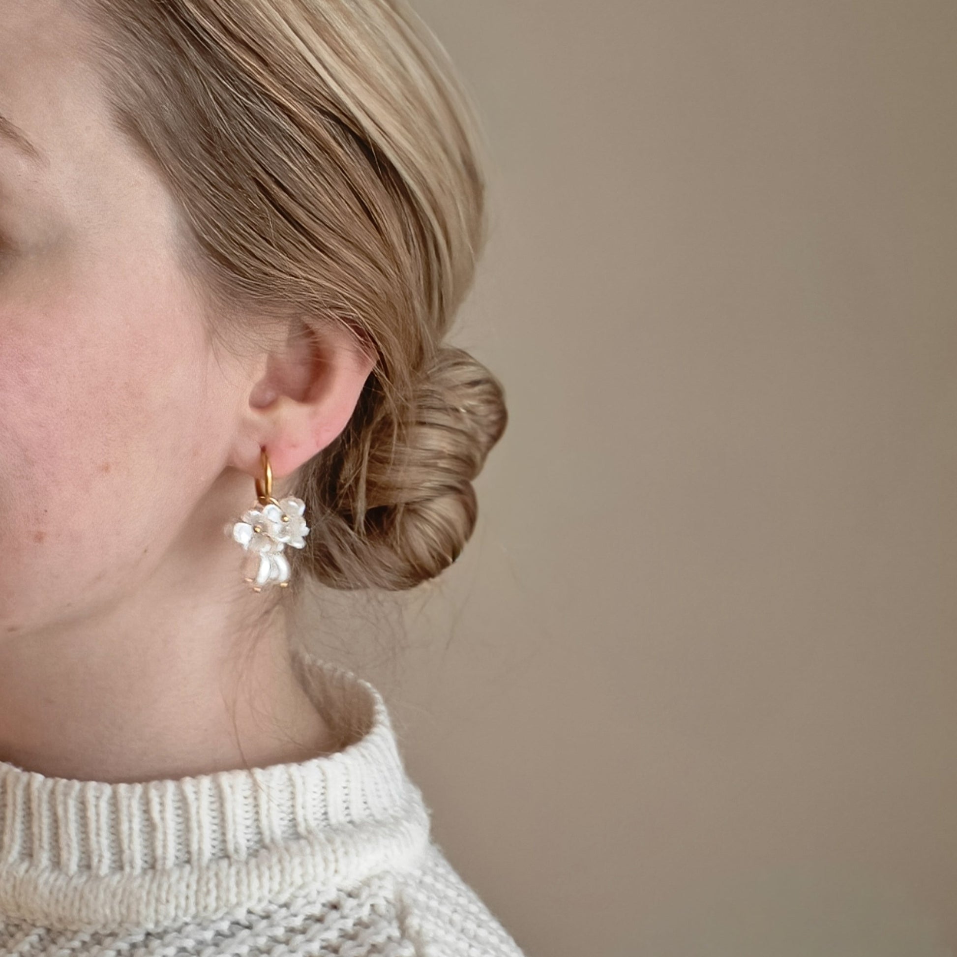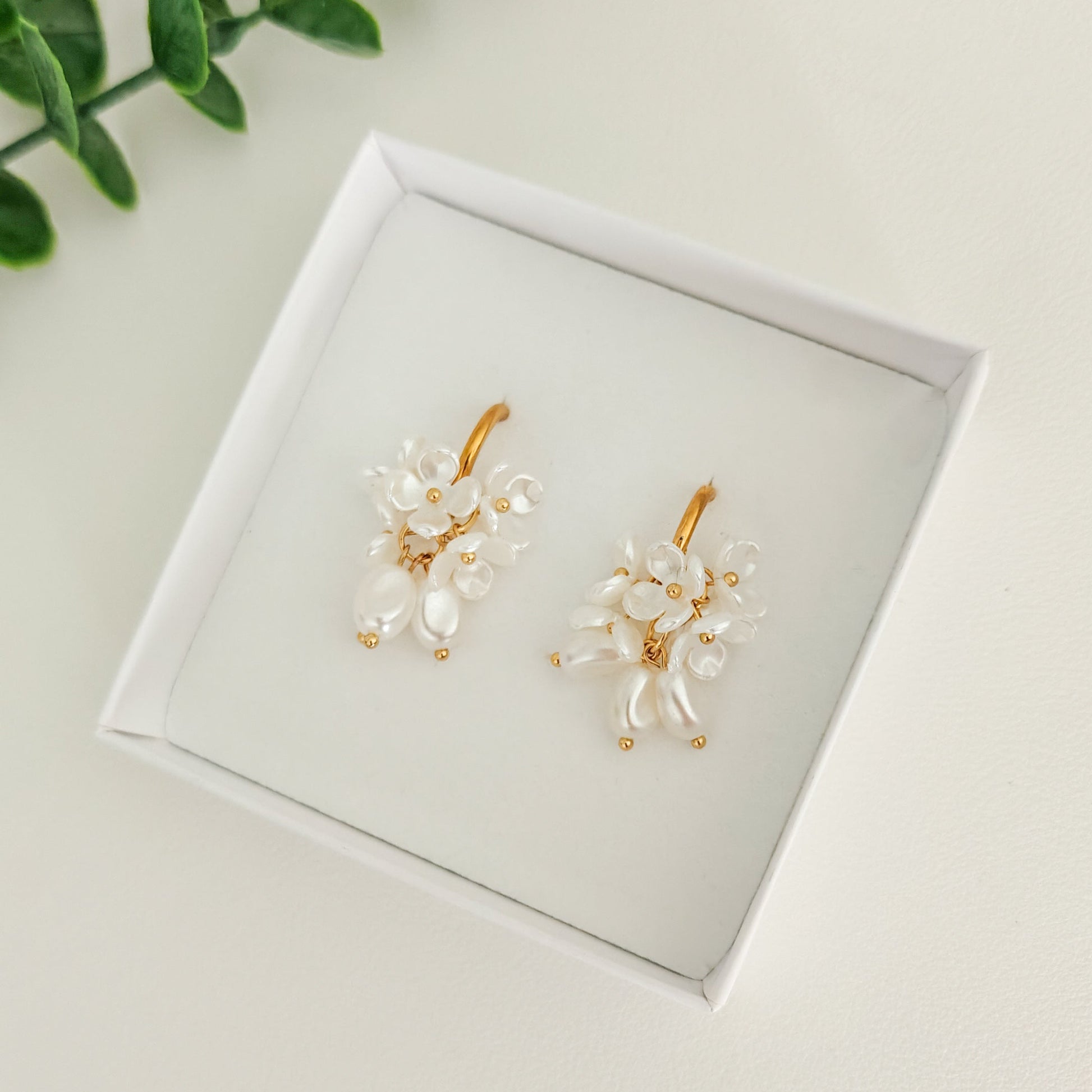 Kauniit ja yksinkertaiset roikkuvat kukat sekä helmet. Sopivat hyvin niin arkeen kuin juhlaan. Saatavilla myös hopeisena.