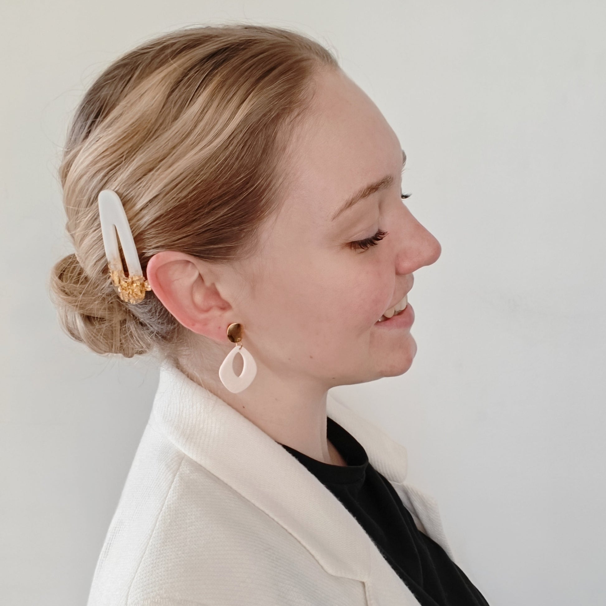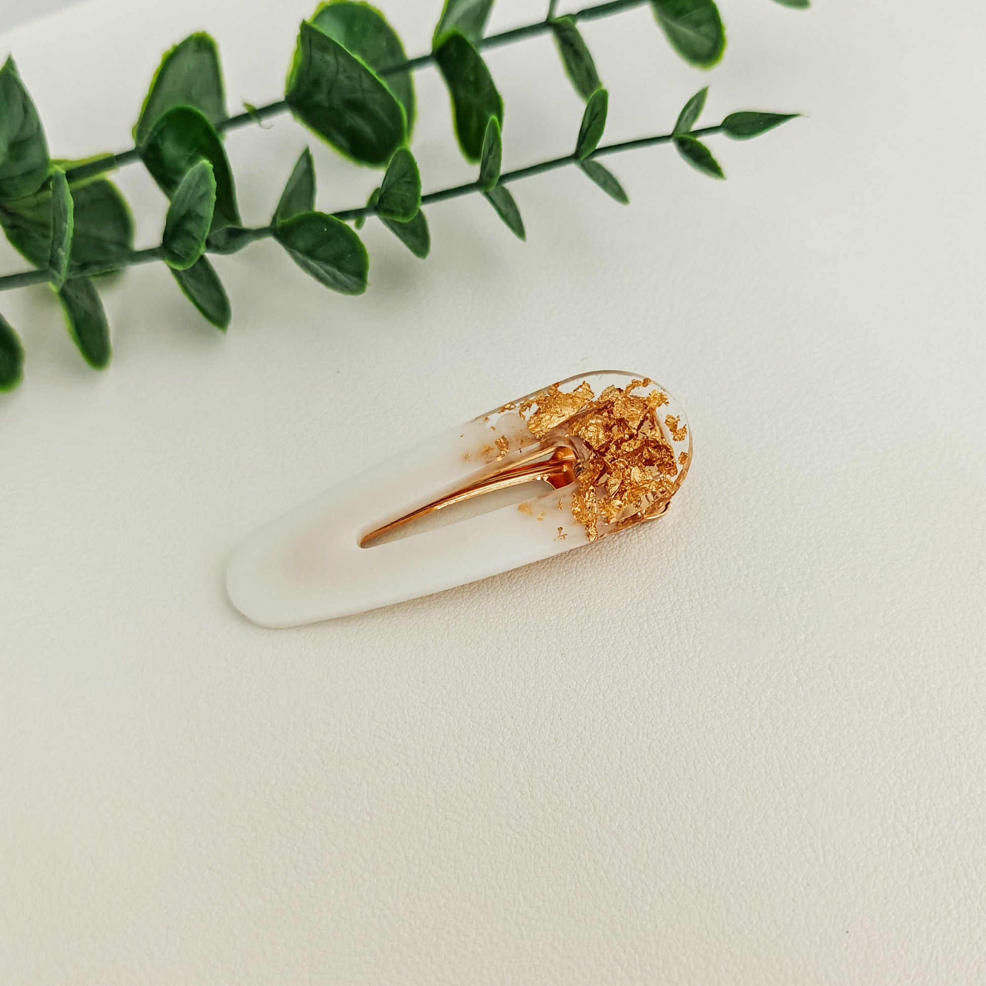 Epoksista valmistettu kultavalkoinen hiuspinni. Värissä myös kultaista kimalletta.