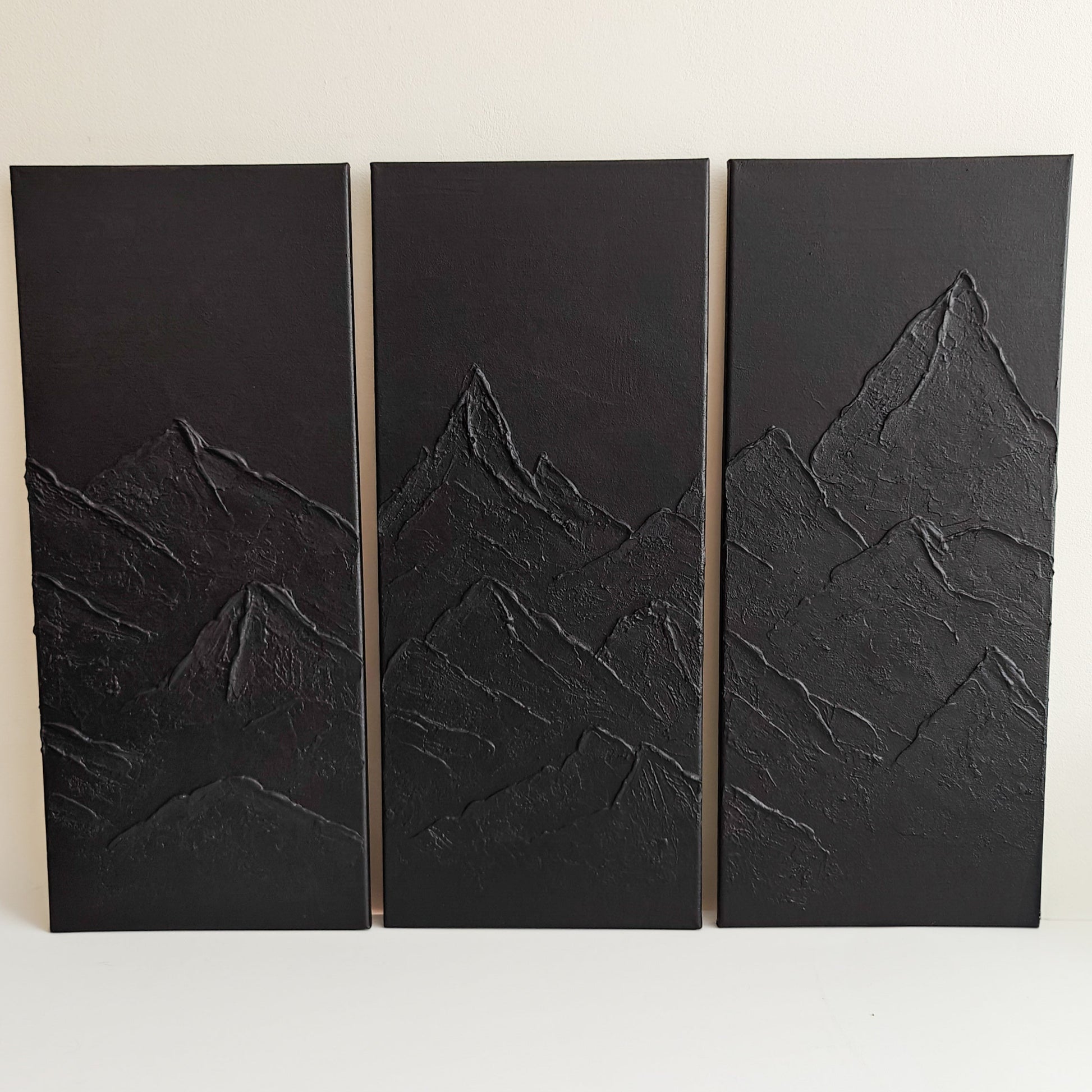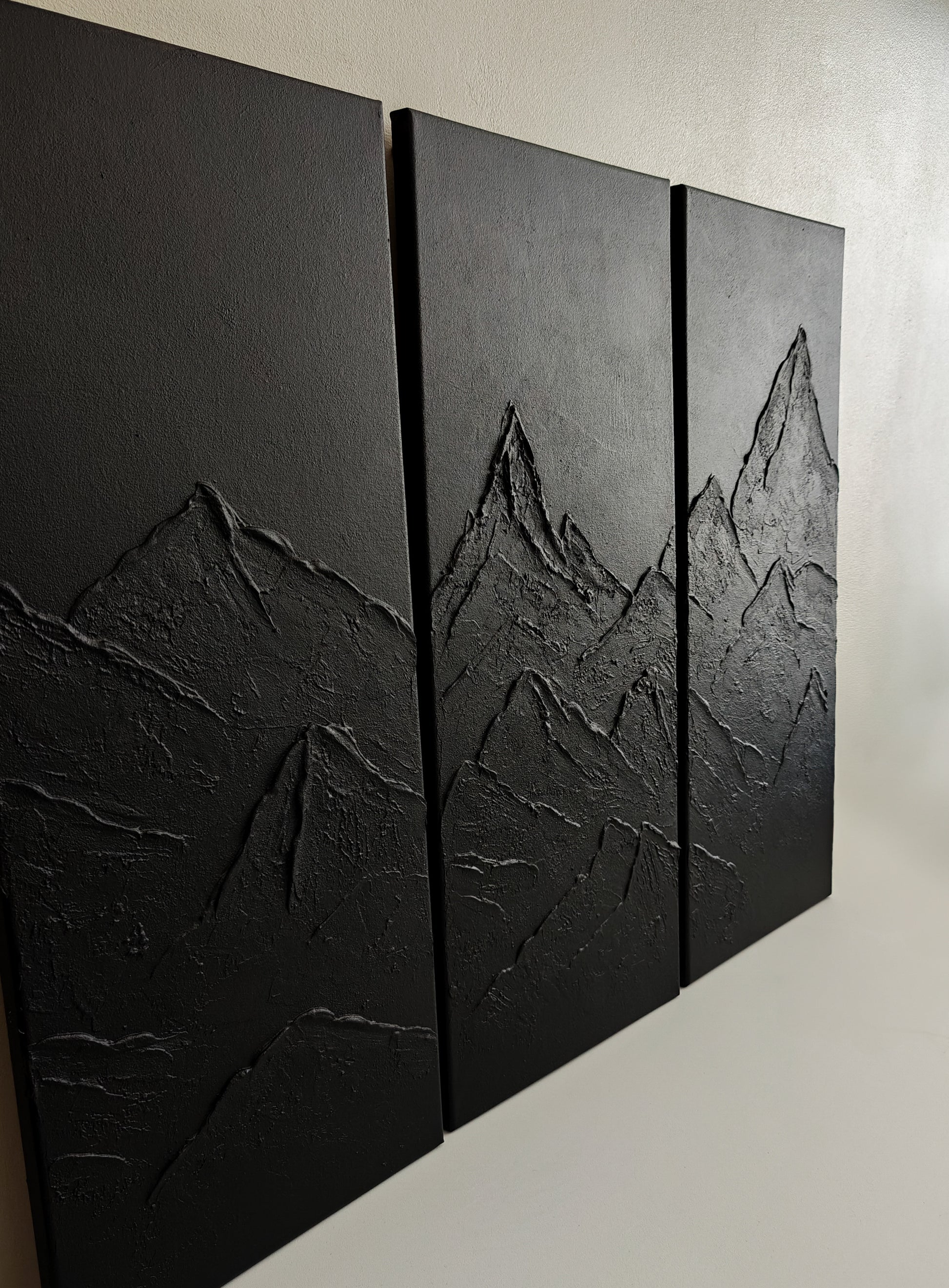 Käsintehty musta näyttävä akryylitaulu canvaalle. Koko 30x70cm x3. Taulu on suojattu lakalla, joten pölyjen pyyhkiminen on helppoa eikä värit haalistu.