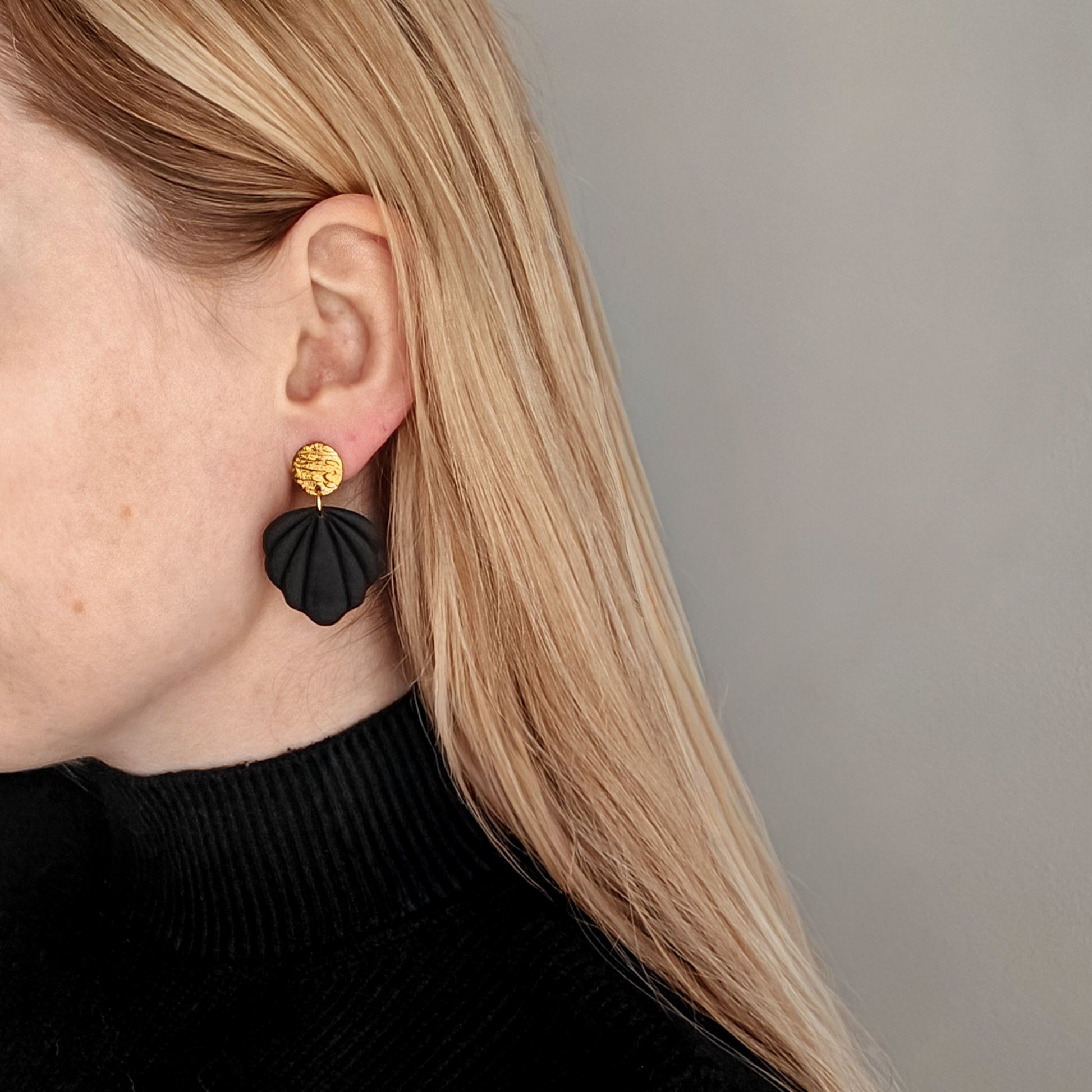 Musta Haapa on kultaisella napilla kiinnitettävä kaunis korvakoru, joka sopii hyvin käytettäväksi arkena tai juhlissa.
