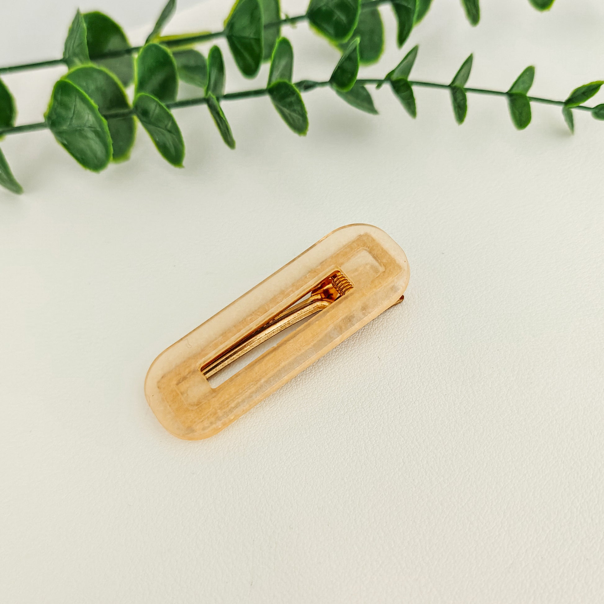Epoksista valmistettu vaaleanoranssi hiuspinni.