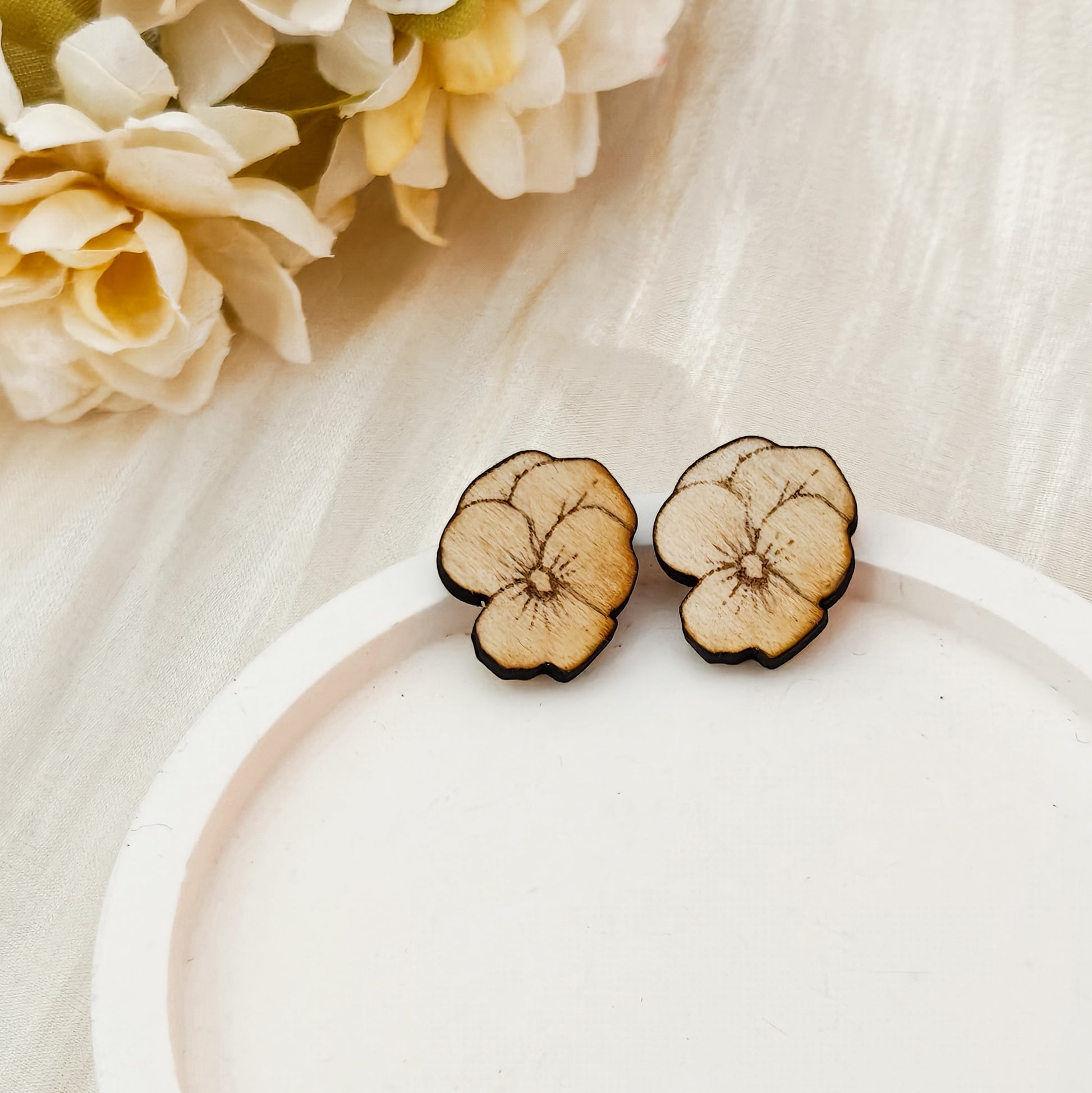 Puusta valmistetut orvokki nappikorut. Nämä kauniit korvakorut ovat 100% käsintehtyjä, jokainen pari on valmistettu yksilöllisesti huolella ja rakkaudella.