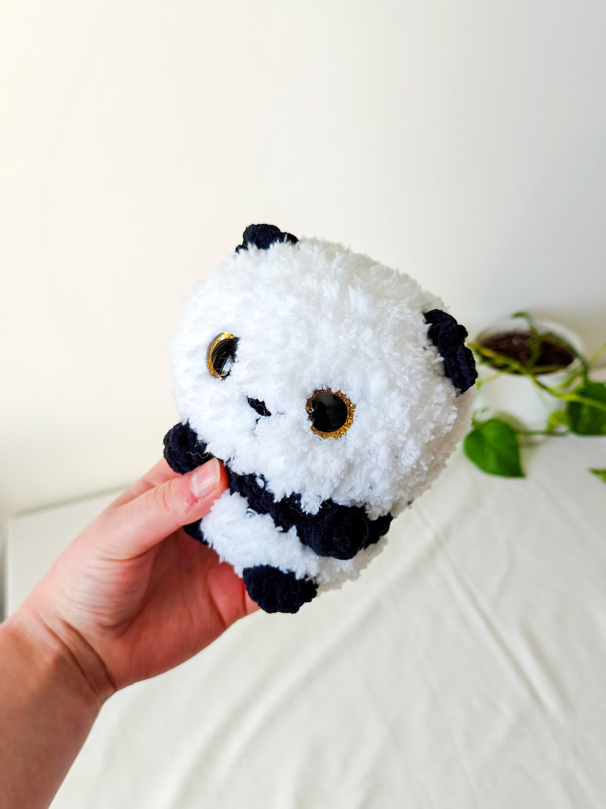 Käsintehty söpö pieni pörröinen panda. Valmistettu ihanan pehmeästä ja pörröisestä langasta. 100% mikropolyesteri.