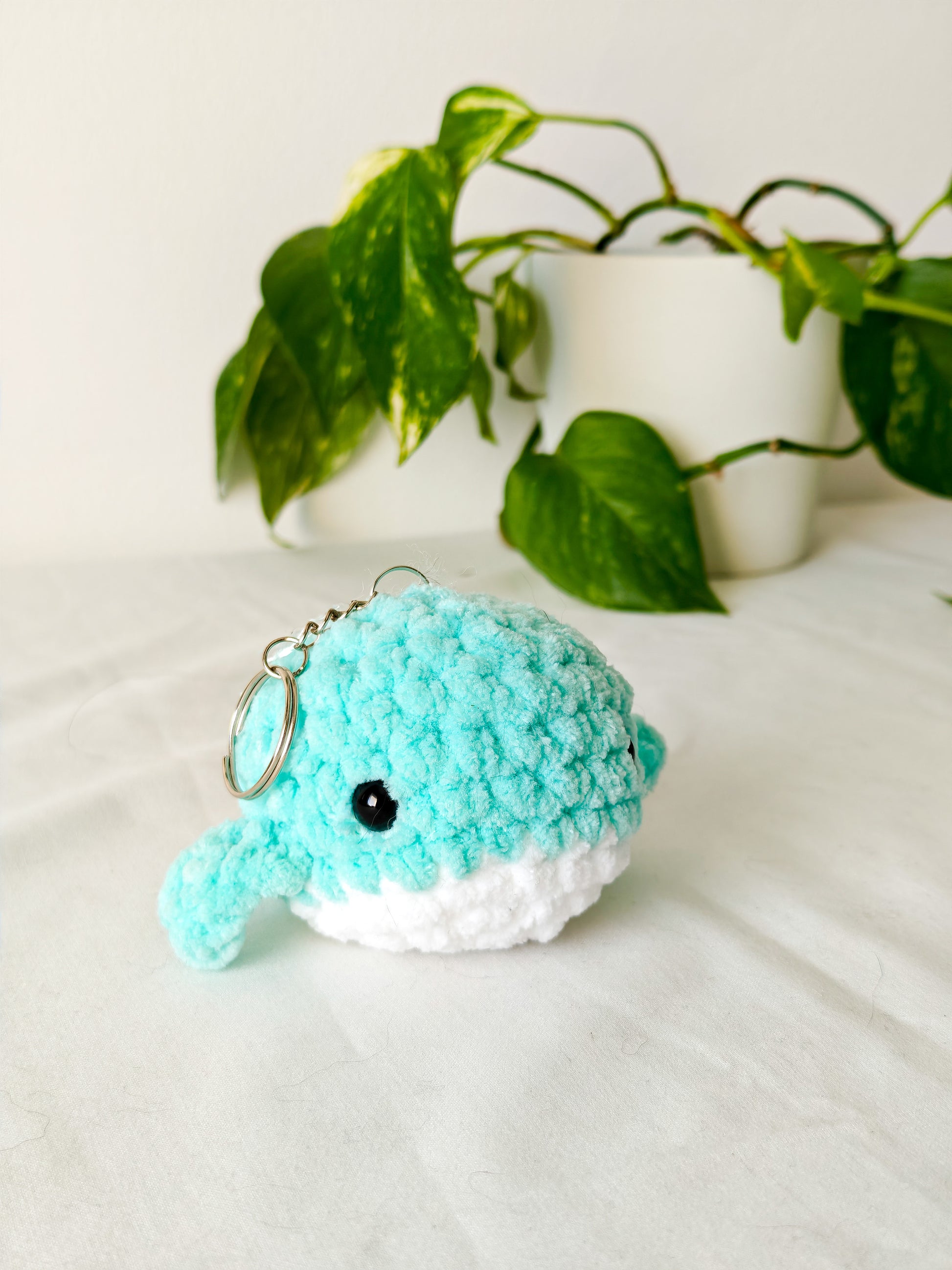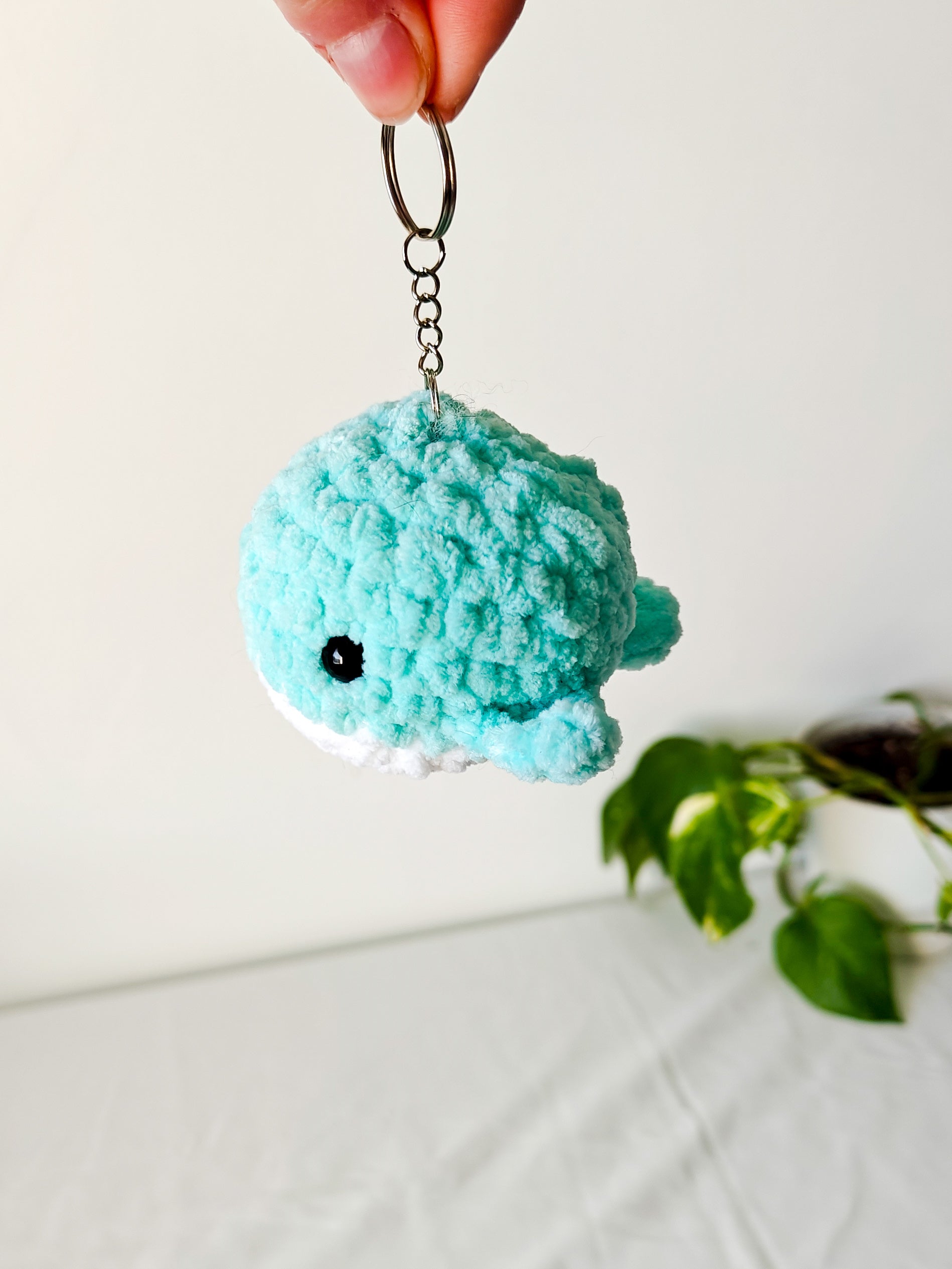 Käsintehty söpö vaaleansininen valas mustilla nappisilmillä. Valmistettu ihanan pehmeästä ja pörröisestä langasta. 100% mikropolyesteri. Tämän saa kiinnitettyä vaikka reppuun ja pitää sitä aina matkassa mukana. Halutessaan avaimenperän saa myös irti ja pidettyä pelkkänä leluna.