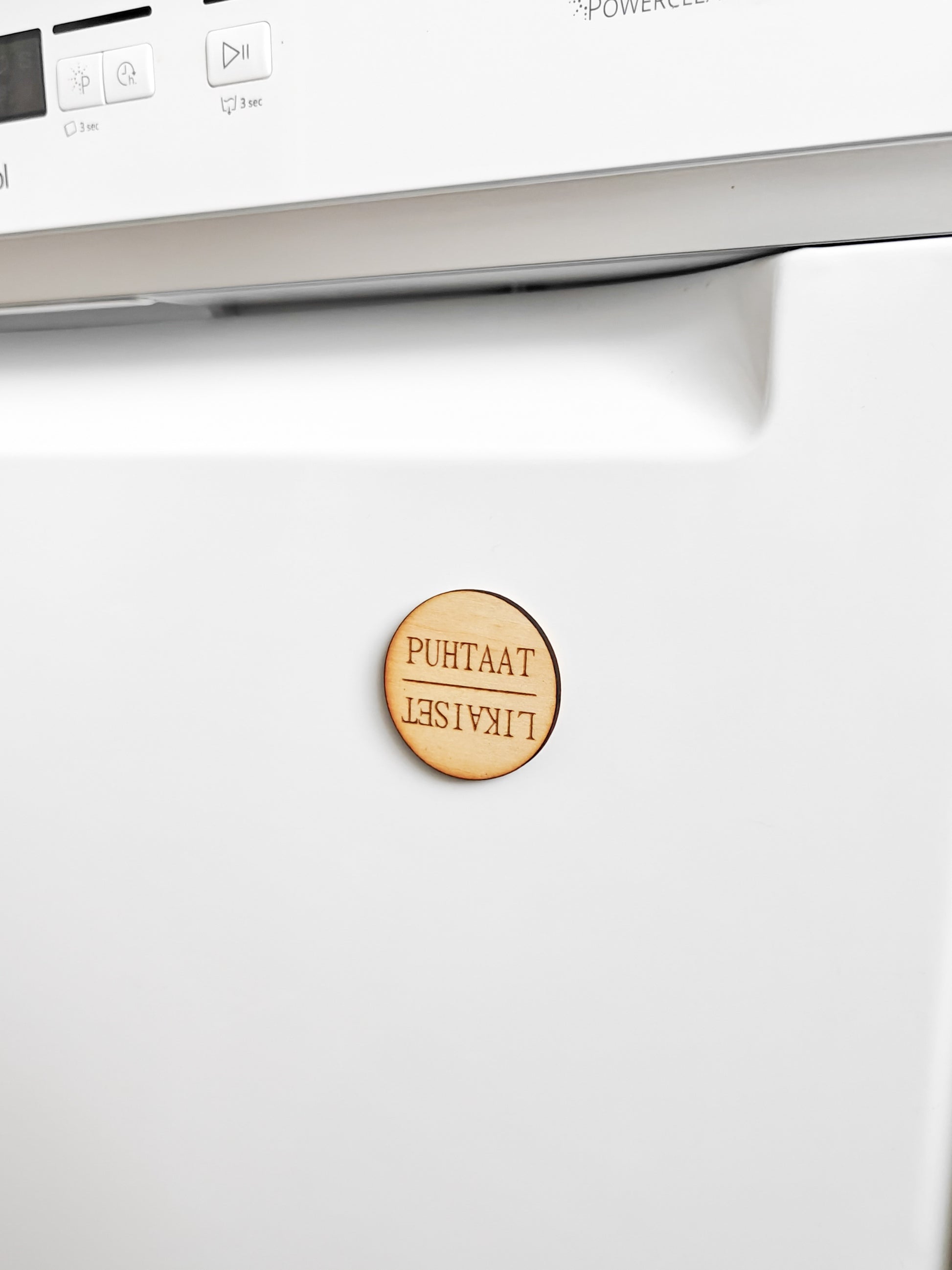 Käsityönä puusta valmistetut magneetit. Tämän magneetin avulla tiedät heti, onko koneessa puhtaita vai likaisia tiskejä. Tällä saa hyvin tuotu pientä hauskuutta tiskien laittoon. Tämä magneetti on sekä käytännöllinen että esteettinen lisä kotiisi.