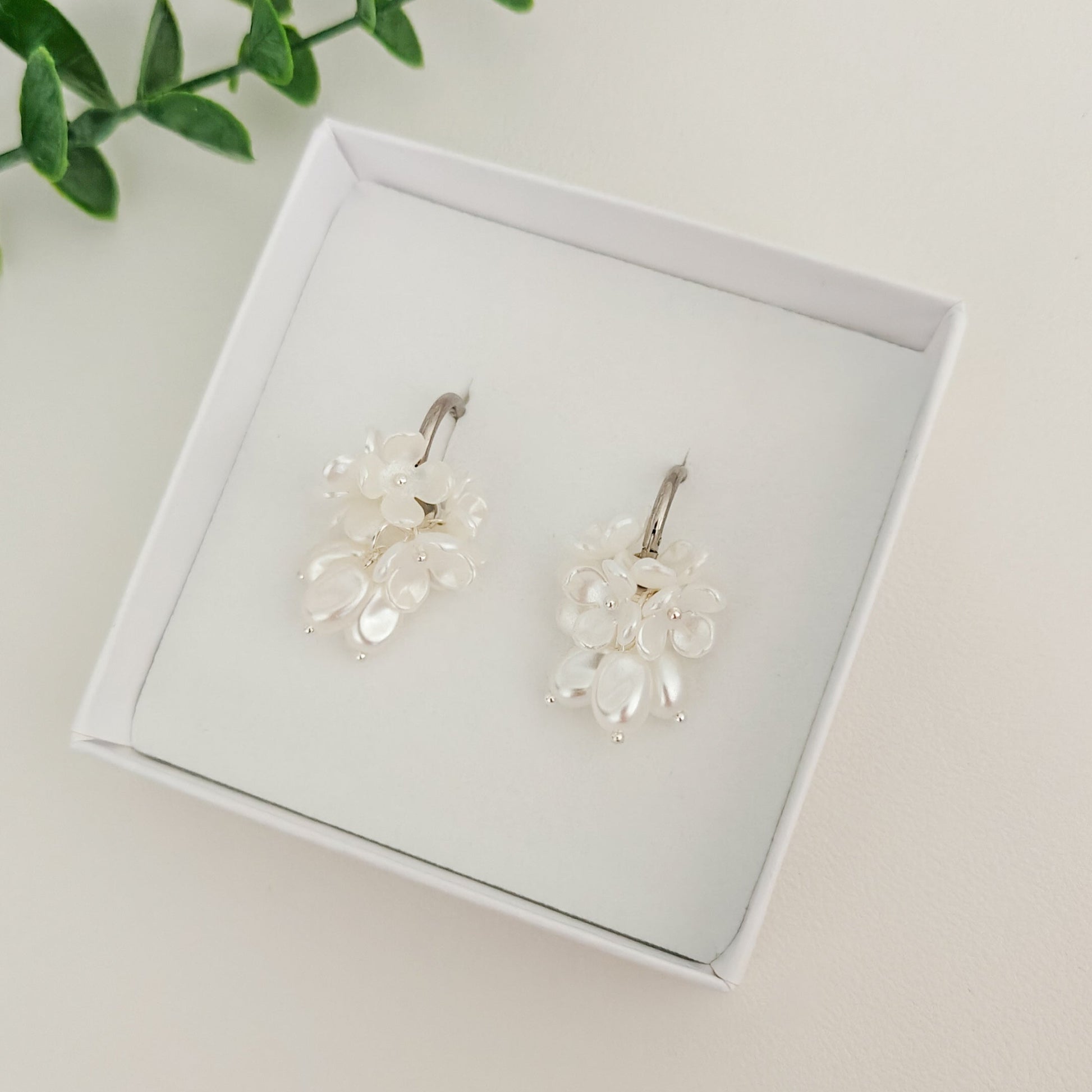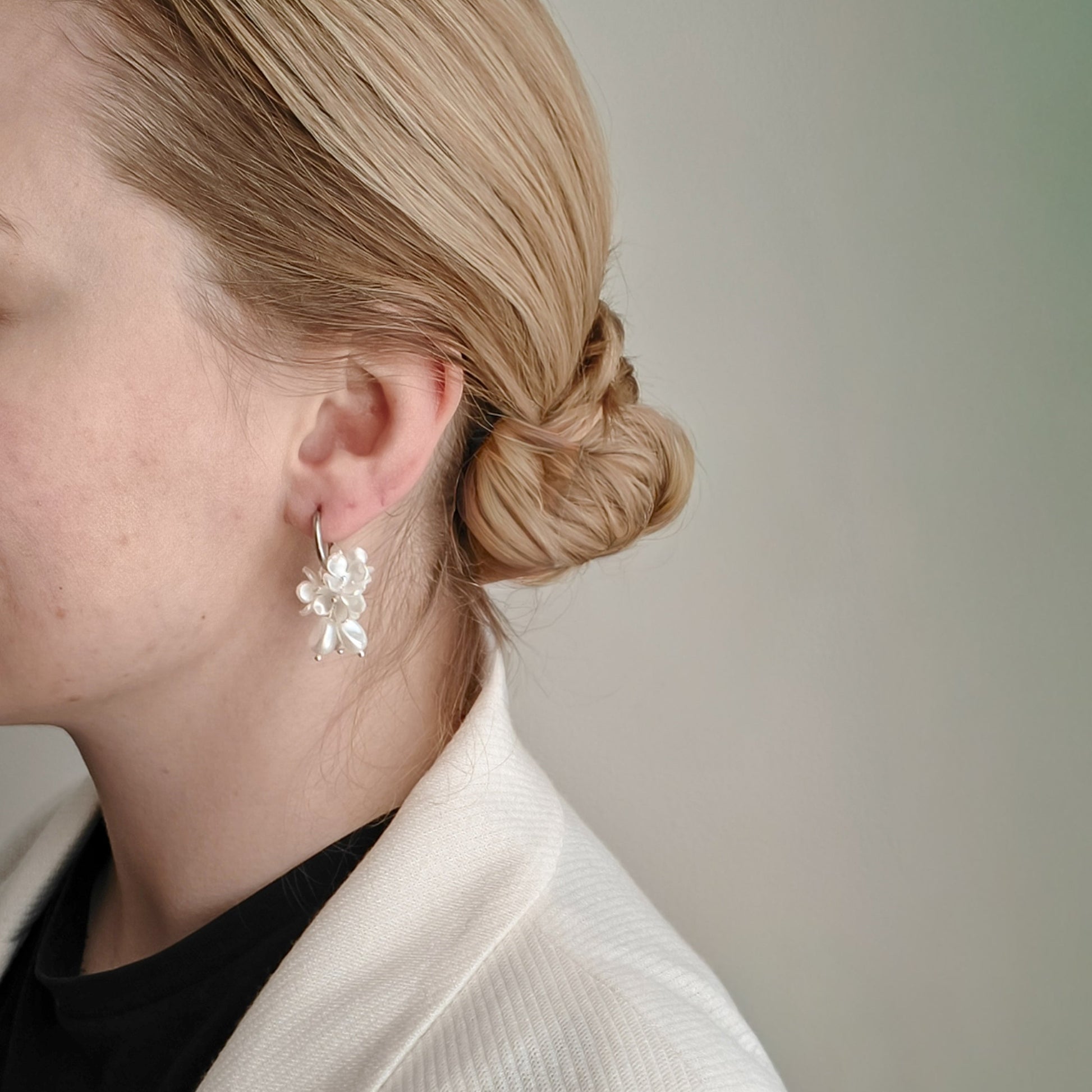 Kauniit ja yksinkertaiset roikkuvat kukat sekä helmet. Sopivat hyvin niin arkeen kuin juhlaan. Saatavilla myös kultaisena.