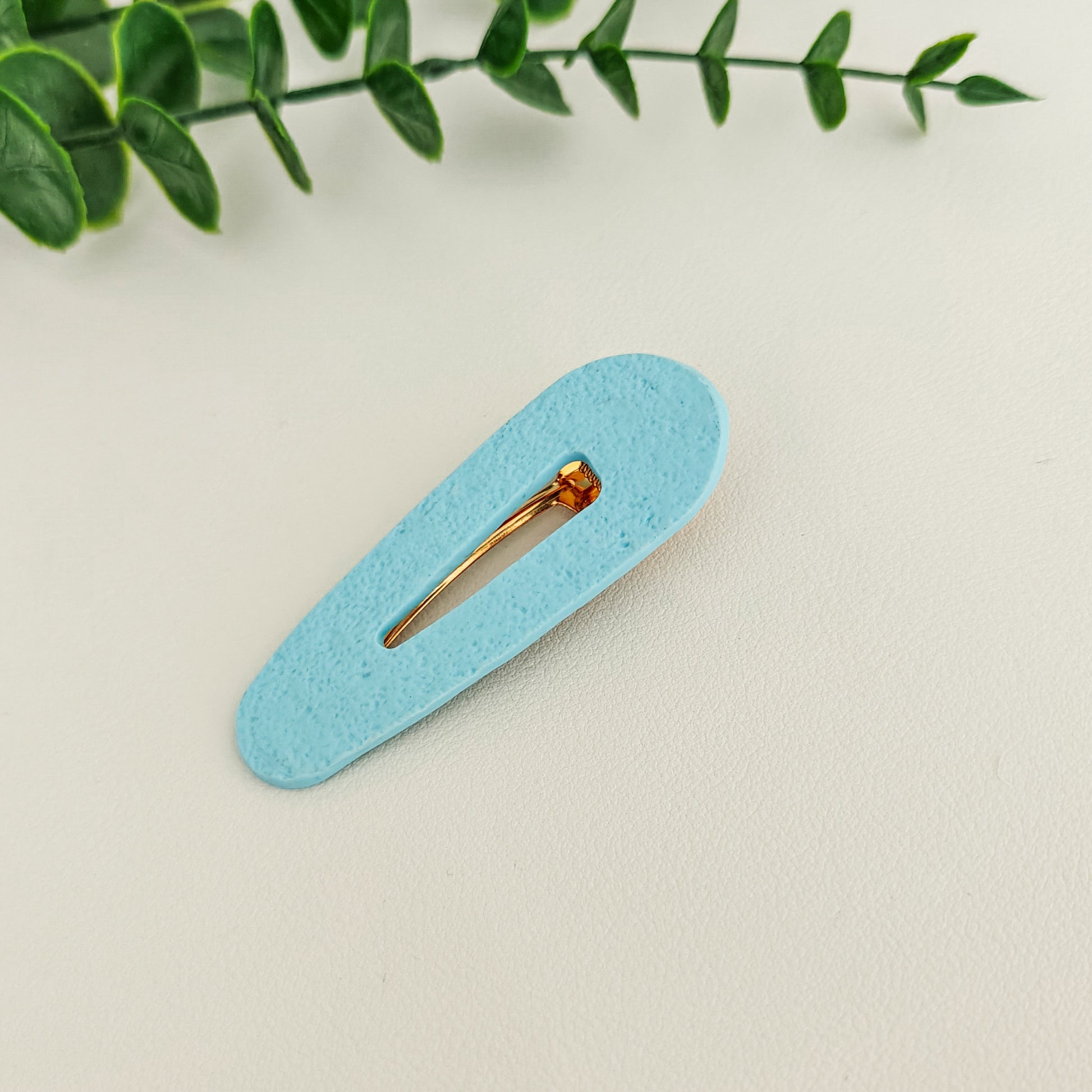 Polymeerisavesta valmistettu sininen hiuspinni. Pitää paksunkin tukan hyvin kiinni.