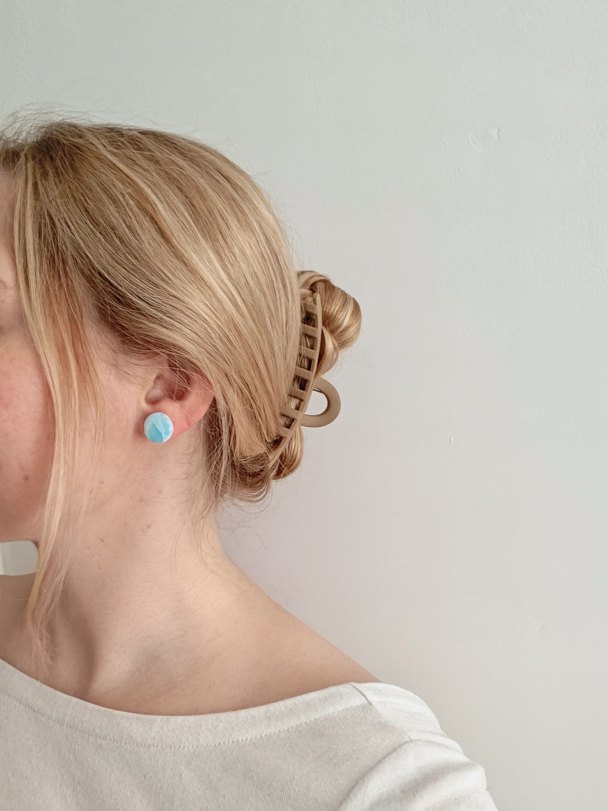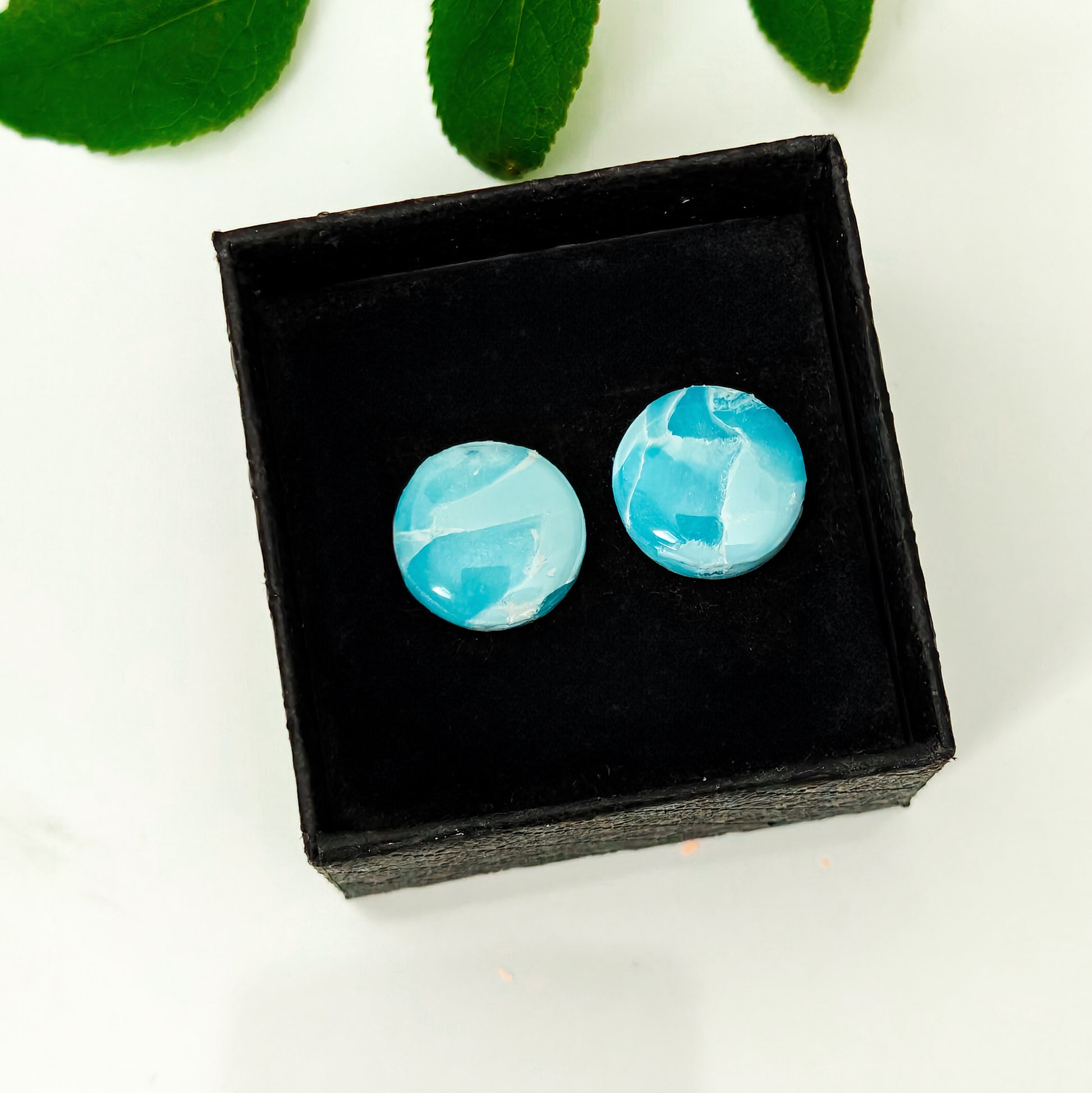 Pyöreät siniset nappikorvakorut, joissa on epoksia pinnalla tuomassa korostusta väreihin sekä kestävyyttä nappeihin. Mukana tulee teräksinen sekä silikoninen tausta.