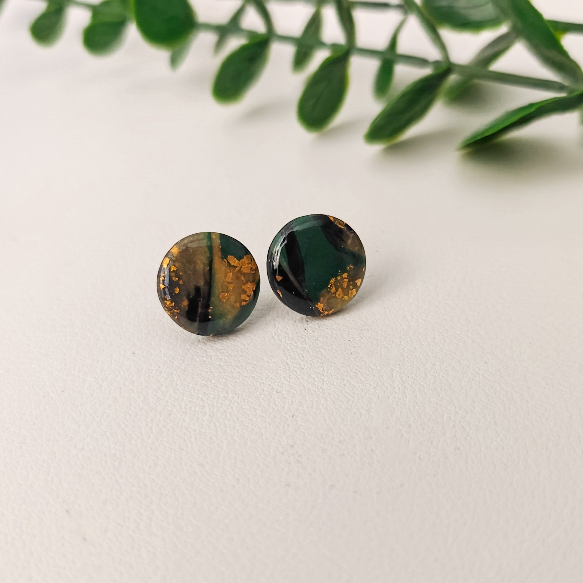 Pyöreät yksityiskohtaiset tummat nappikorvakorut, joissa on epoksia pinnalla tuomassa korostusta väreihin sekä kestävyyttä nappeihin. Mukana tulee teräksinen sekä silikoninen tausta.