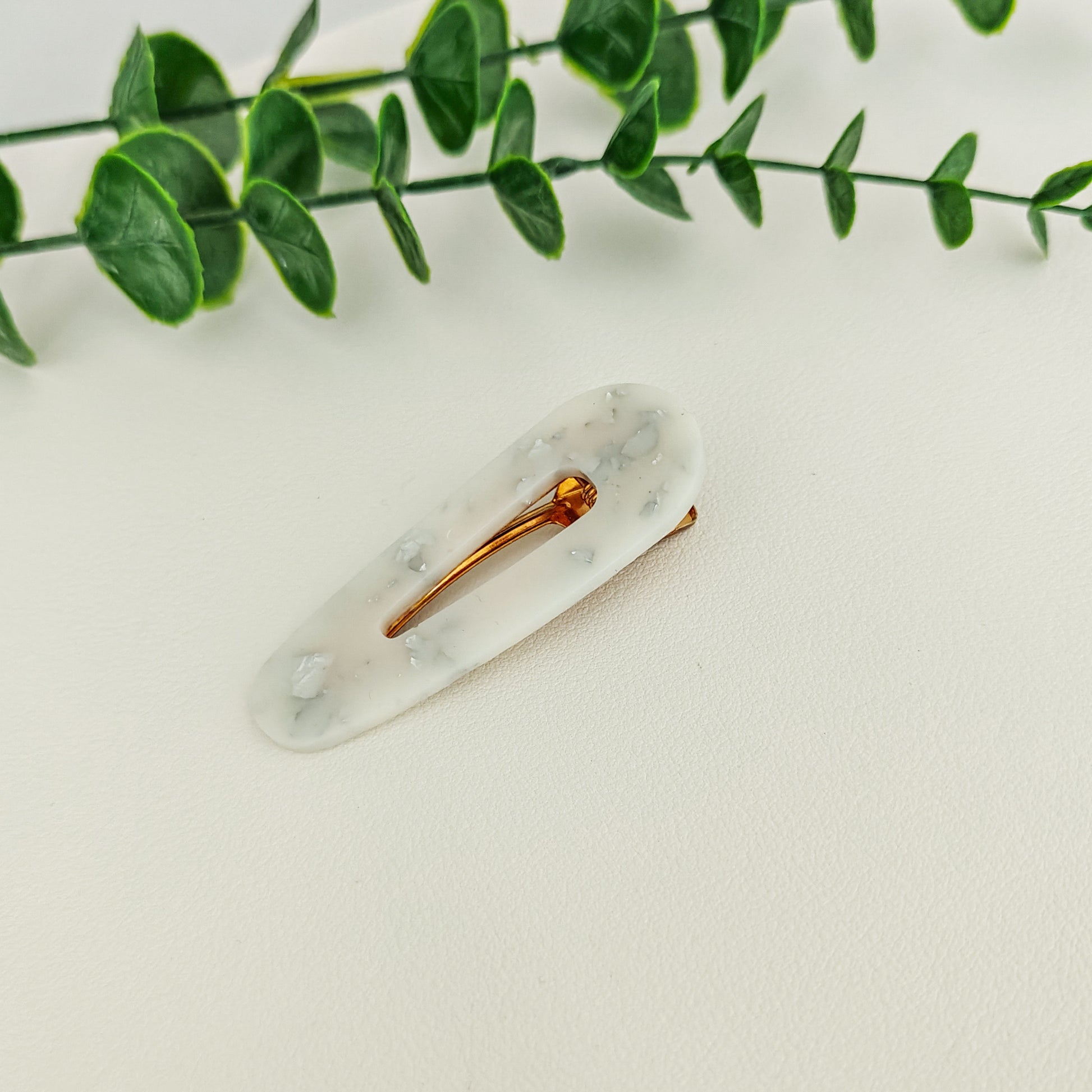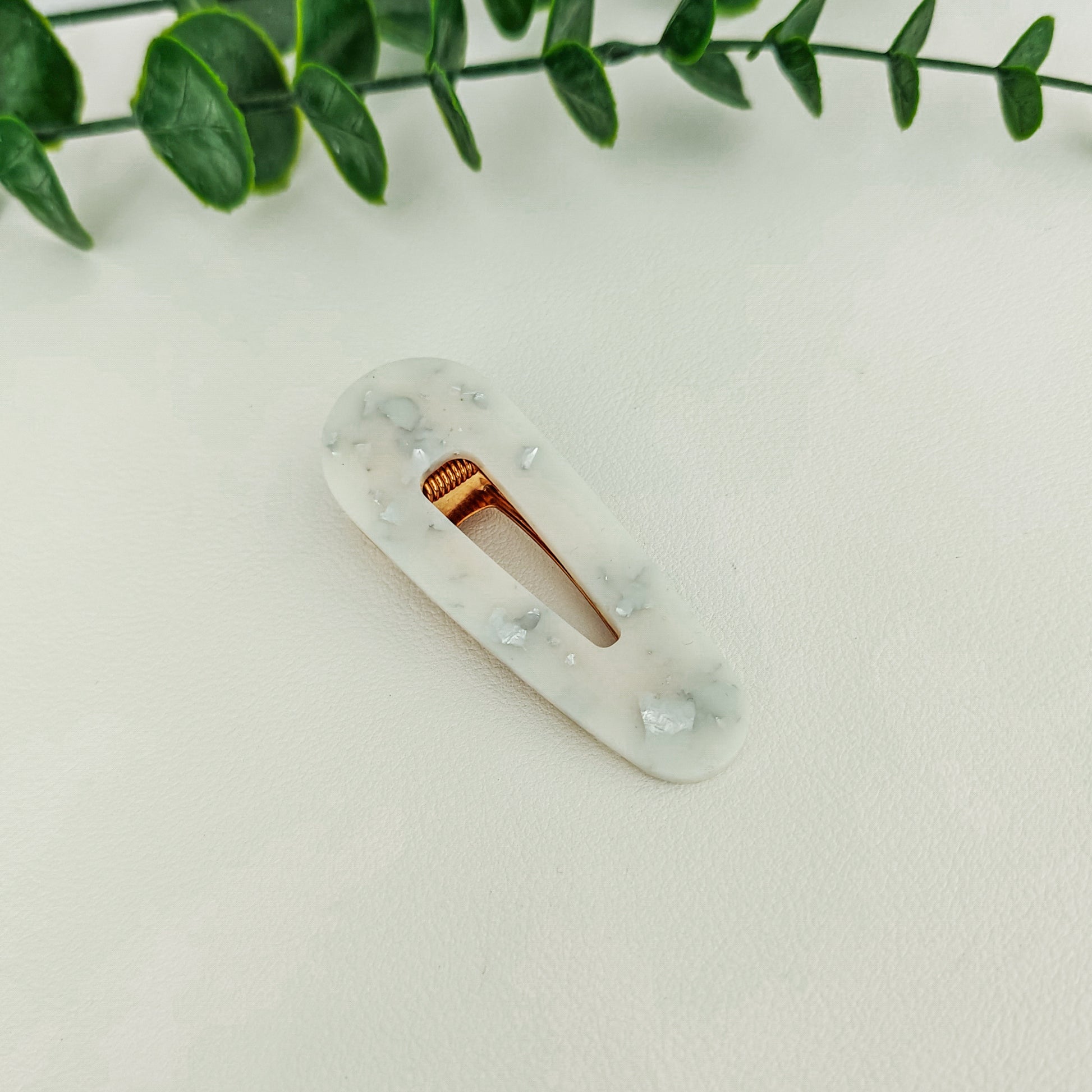 Epoksista ja hopeista hileistä valmistettu vaalea hiuspinni.