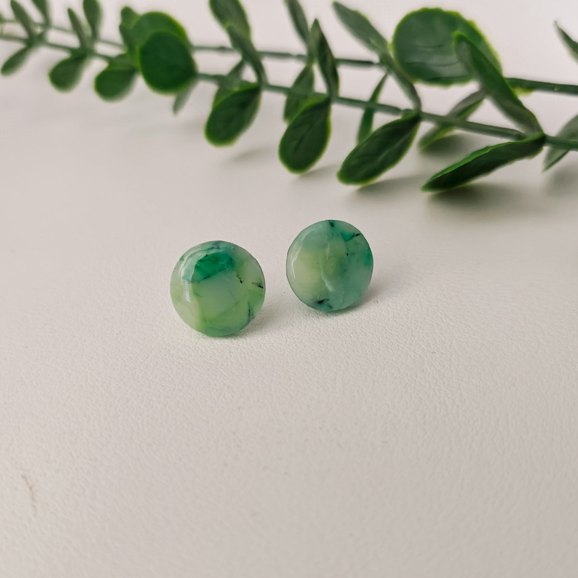 Pyöreät yksityiskohtaiset vaaleanvihreät nappikorvakorut, joissa on epoksia pinnalla tuomassa korostusta väreihin sekä kestävyyttä nappeihin. Mukana tulee teräksinen sekä silikoninen tausta.