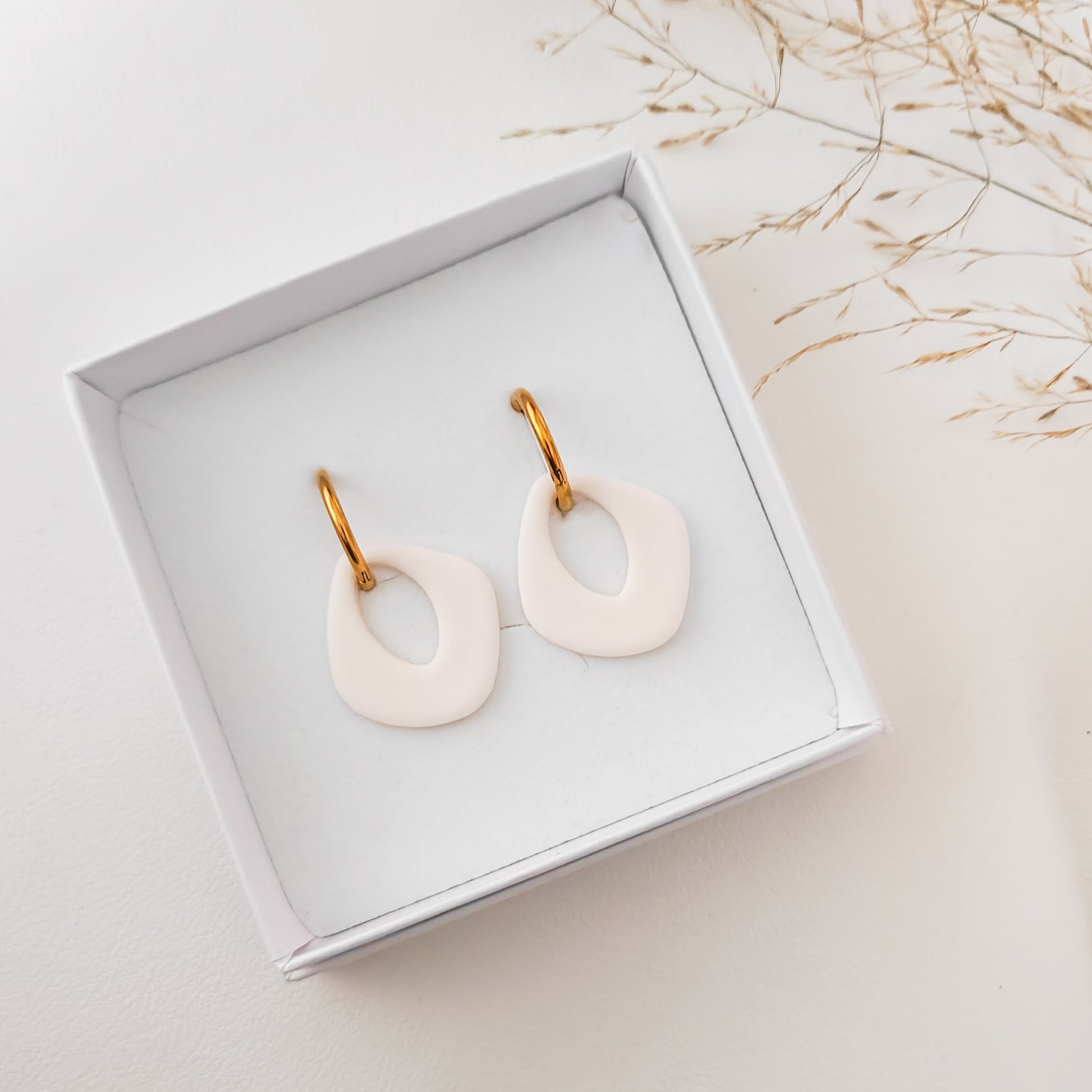 Valkoiset Vera korut ovat yksinkertaiset sekä tyylikkäät korvakorut. Renkaan halkaisia on n.2cm ja se on ruostumatonta terästä 304. Kultaisessa renkaassa on päällä 18K kultaus.