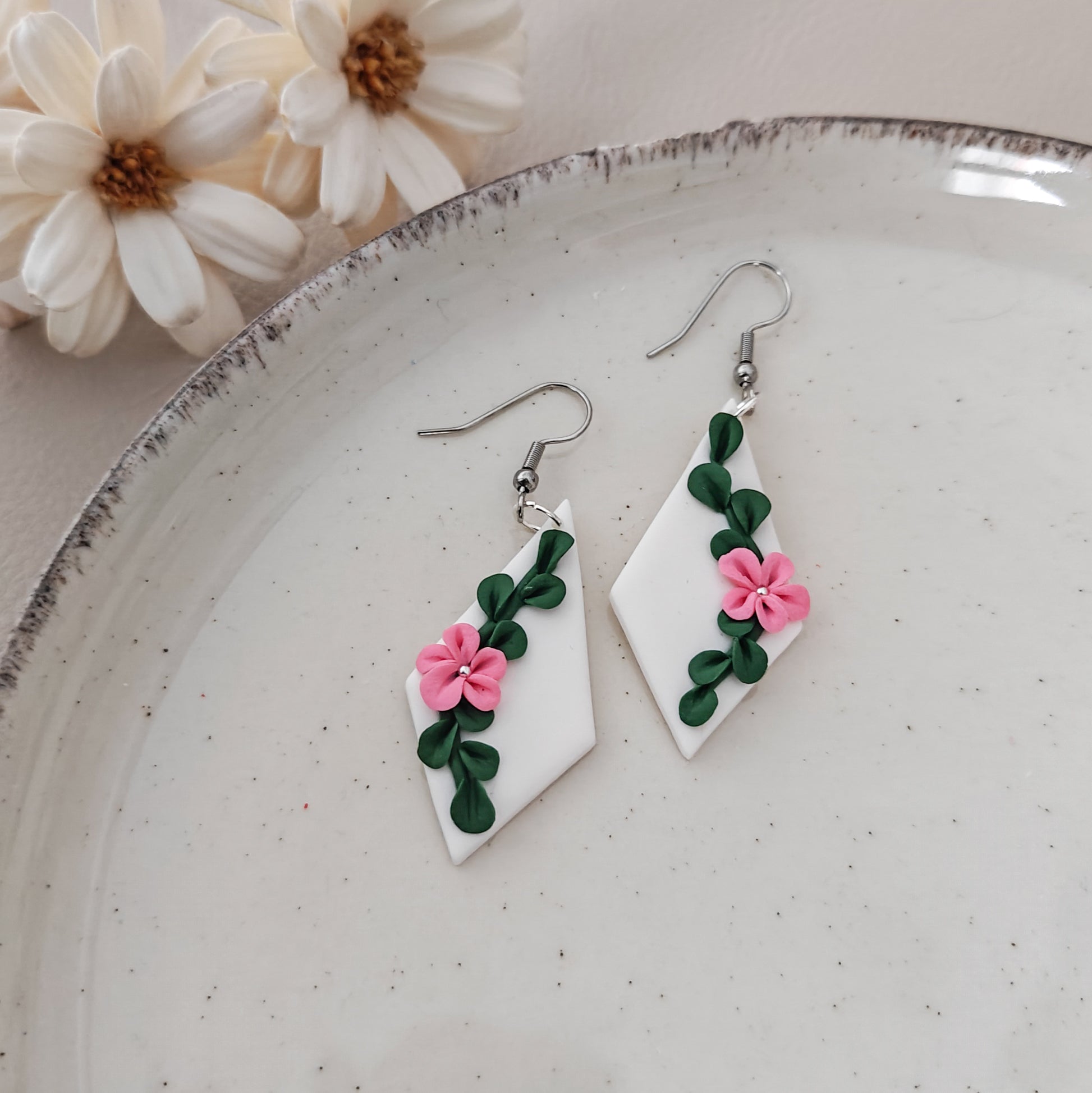 Kauniit yksityiskohtaiset valkoiset kukka korvakorut. Korut kiinnitetään napeilla, joiden mukana tulee teräksinen taustaosa, jotta koru pysyy hyvin paikoillaan.
