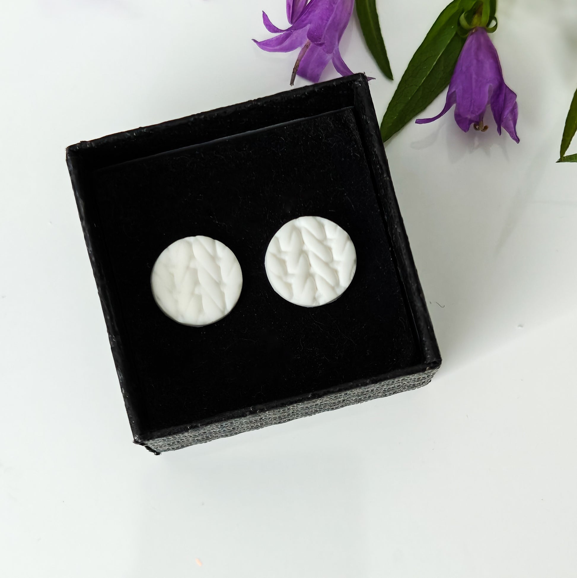 Pyöreät valkoiset nappikorvakorut, joissa on punottu kuvio päällä. Mukana tulee teräksinen sekä silikoninen tausta.