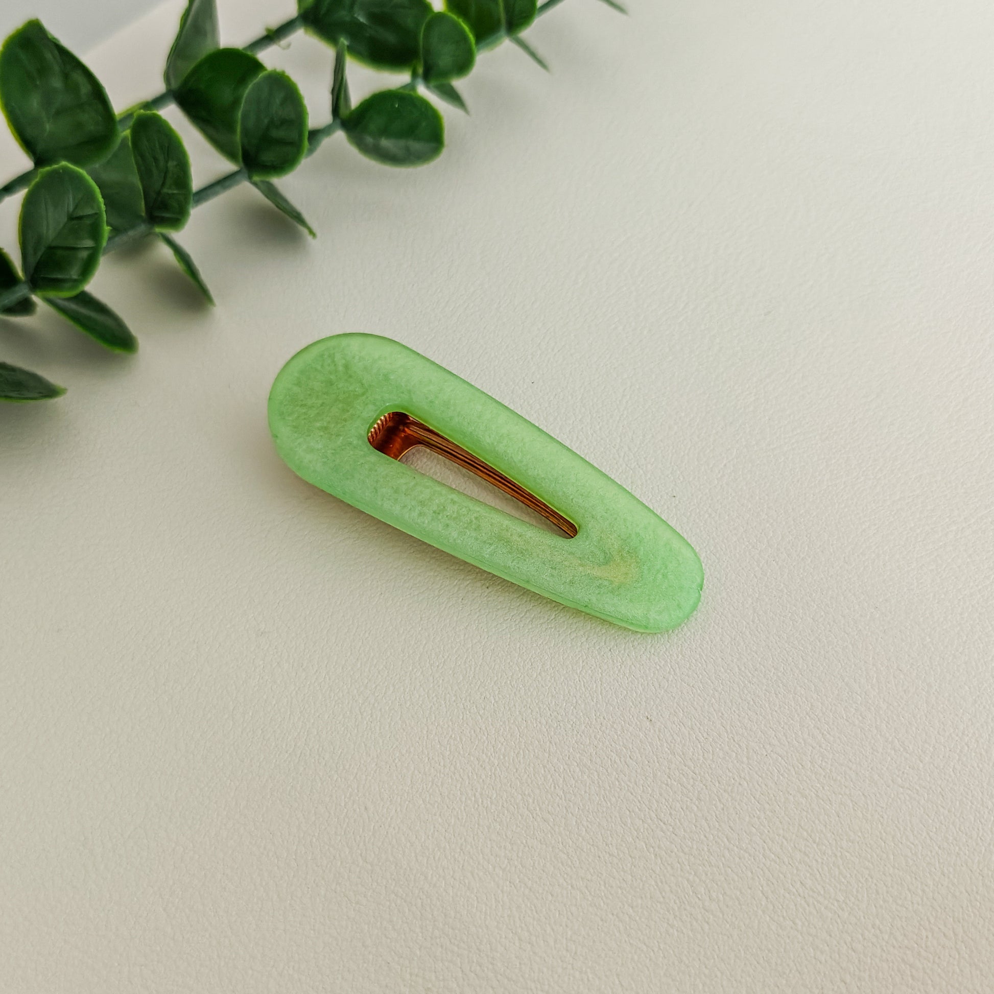 Epoksista valmistettu vihreä hiuspinni.