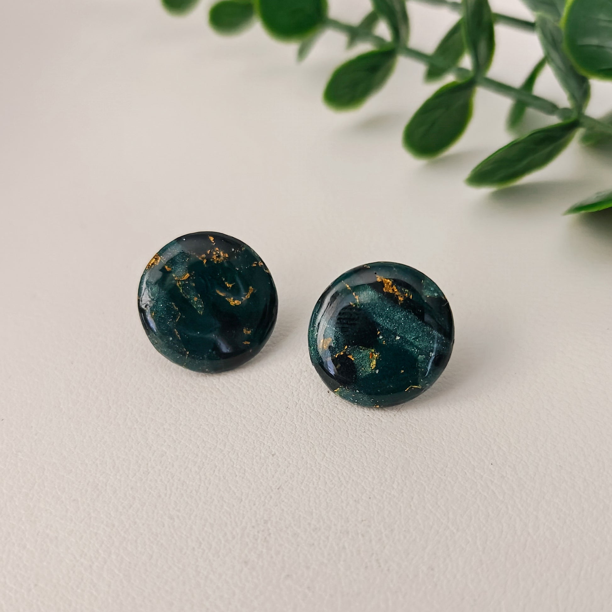 Pyöreät yksityiskohtaiset tummanvihreät nappikorvakorut, joissa on epoksia pinnalla tuomassa korostusta väreihin sekä kestävyyttä nappeihin. Mukana tulee teräksinen sekä silikoninen tausta.